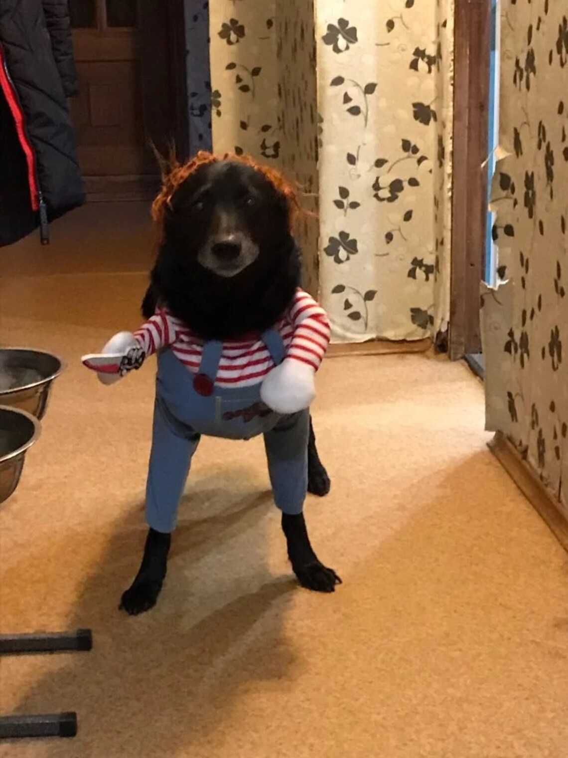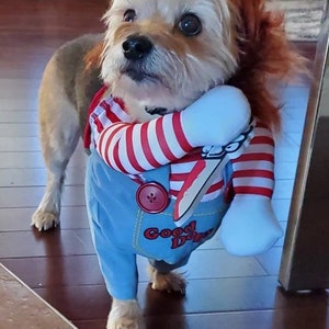 dog running in chucky costume